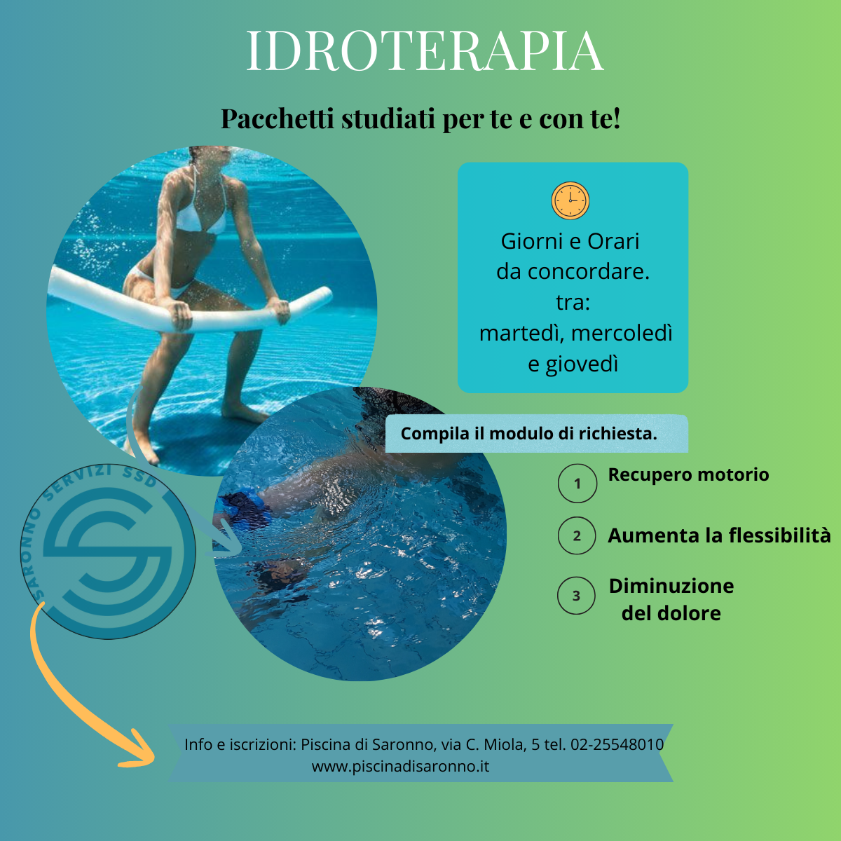 • Idrochinesi Personal: sedute individuali di movimento e massaggio in acqua, con programma personalizzato su indicazione medica o fisioterapica e valutazione iniziale.